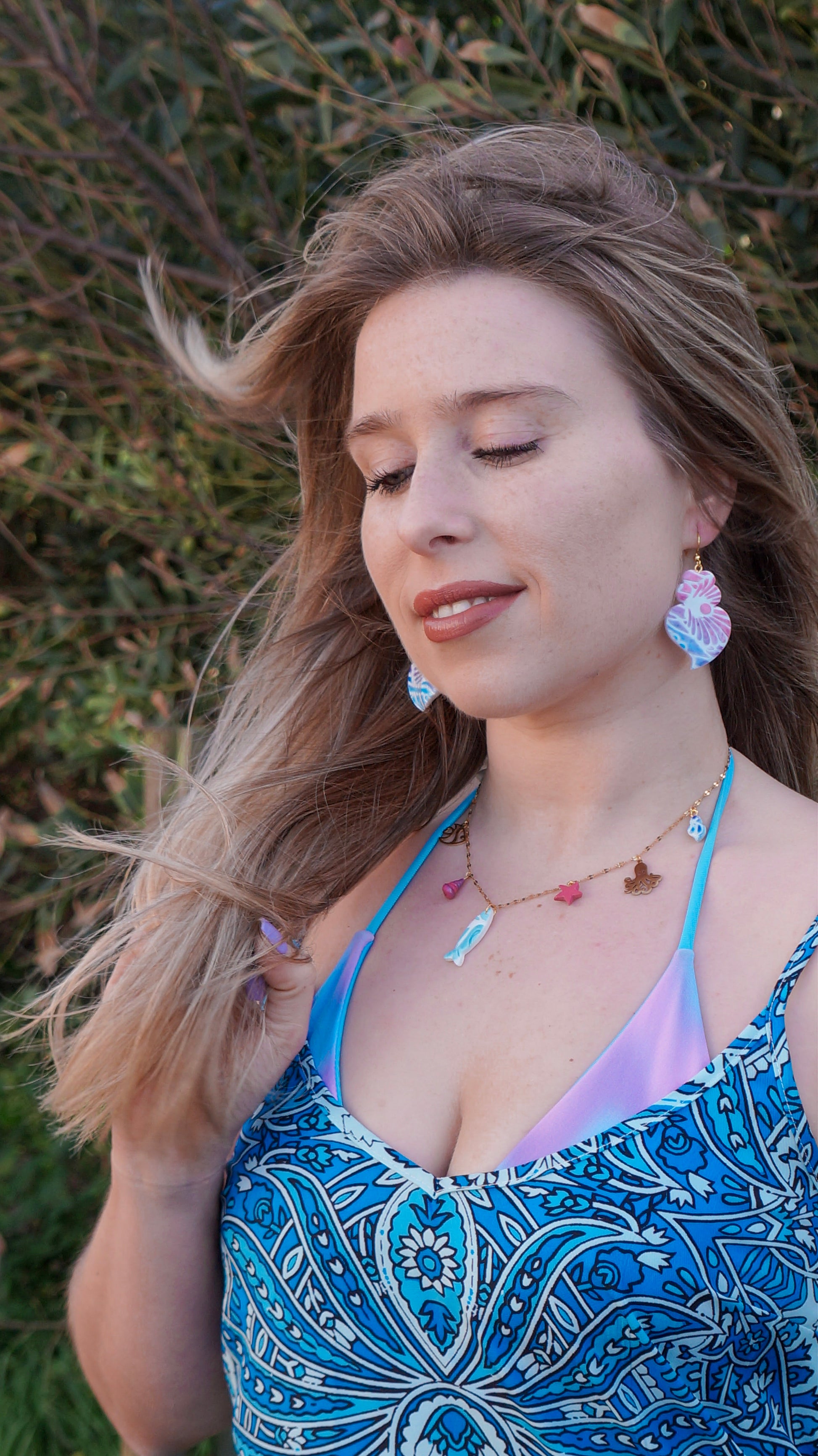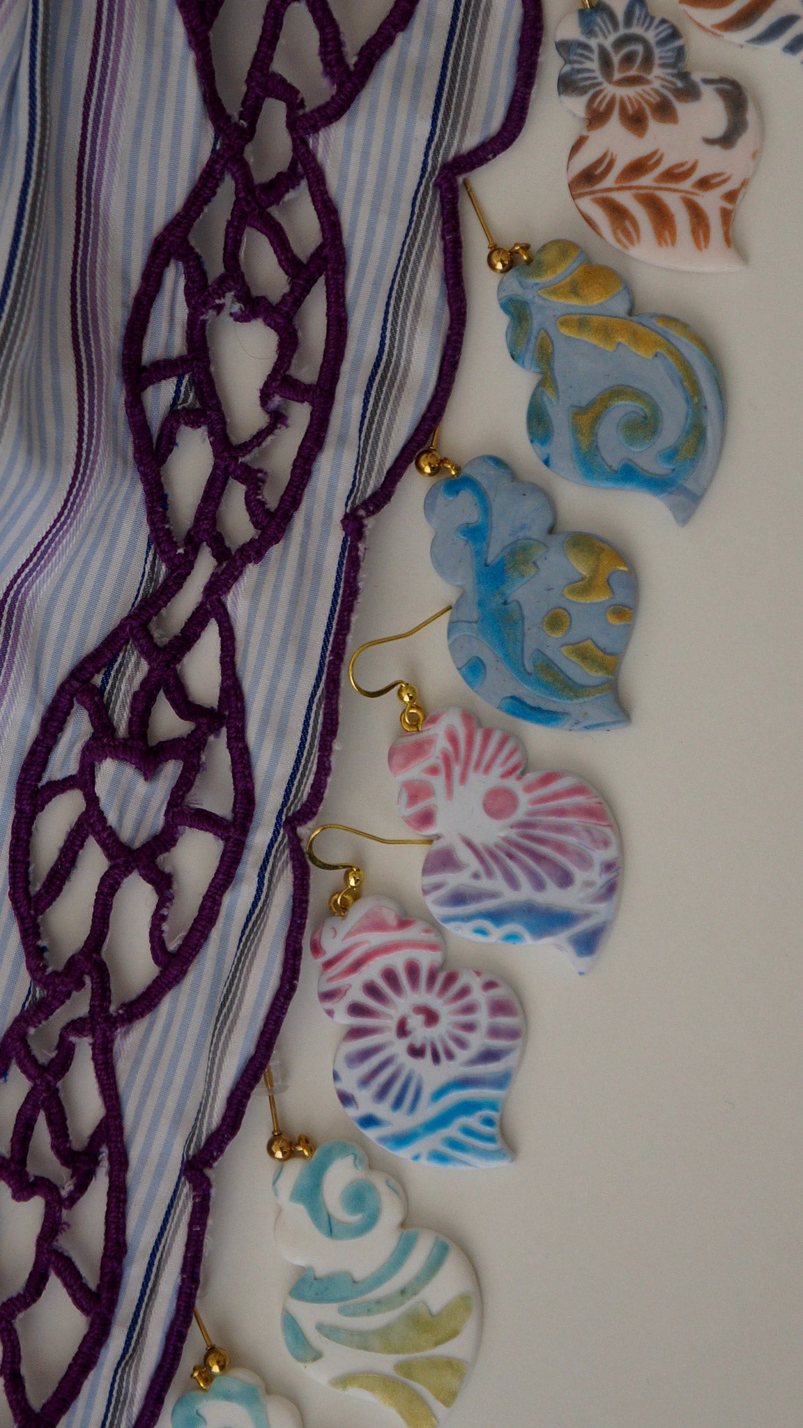 São brincos artesanais que guardam o ritmo do mar e o labor das mulheres da beira-rio, rendados de azul, espuma e flor, feitos para quem leva Viana no peito… e ao ouvido.