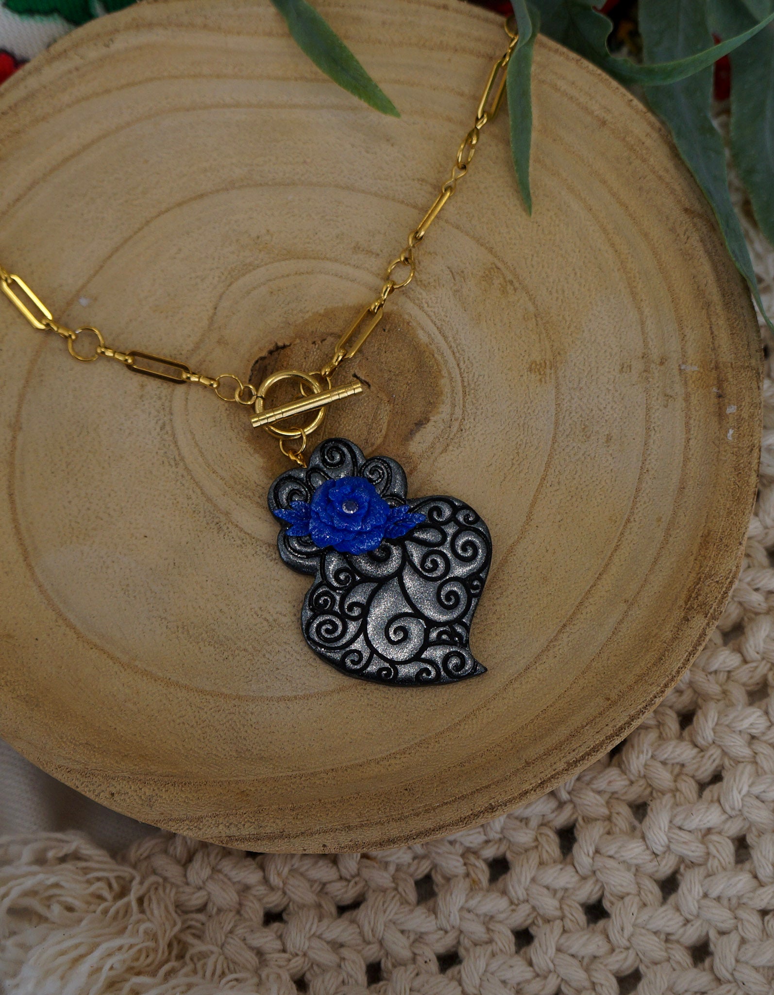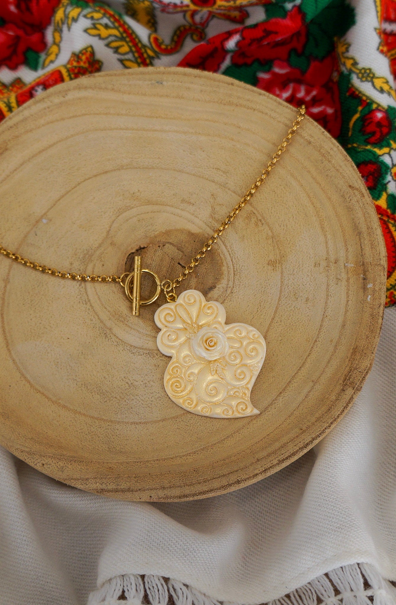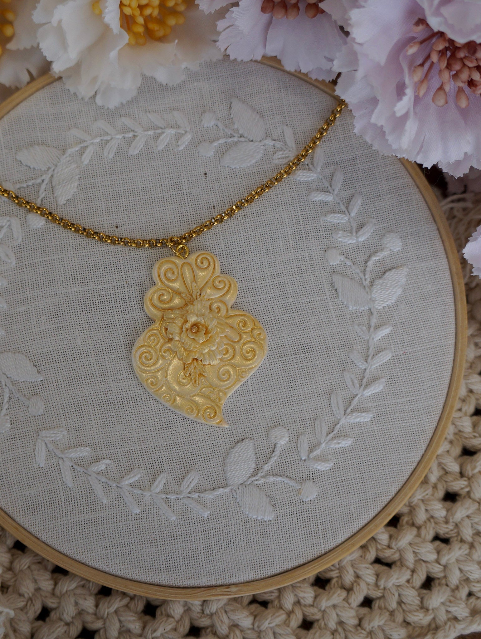 Moldado à mão em argila de polímero, como se cada espiral traçasse a memória das mãos que bordavam em silêncio, das vozes que se cruzavam entre linhas e lides.