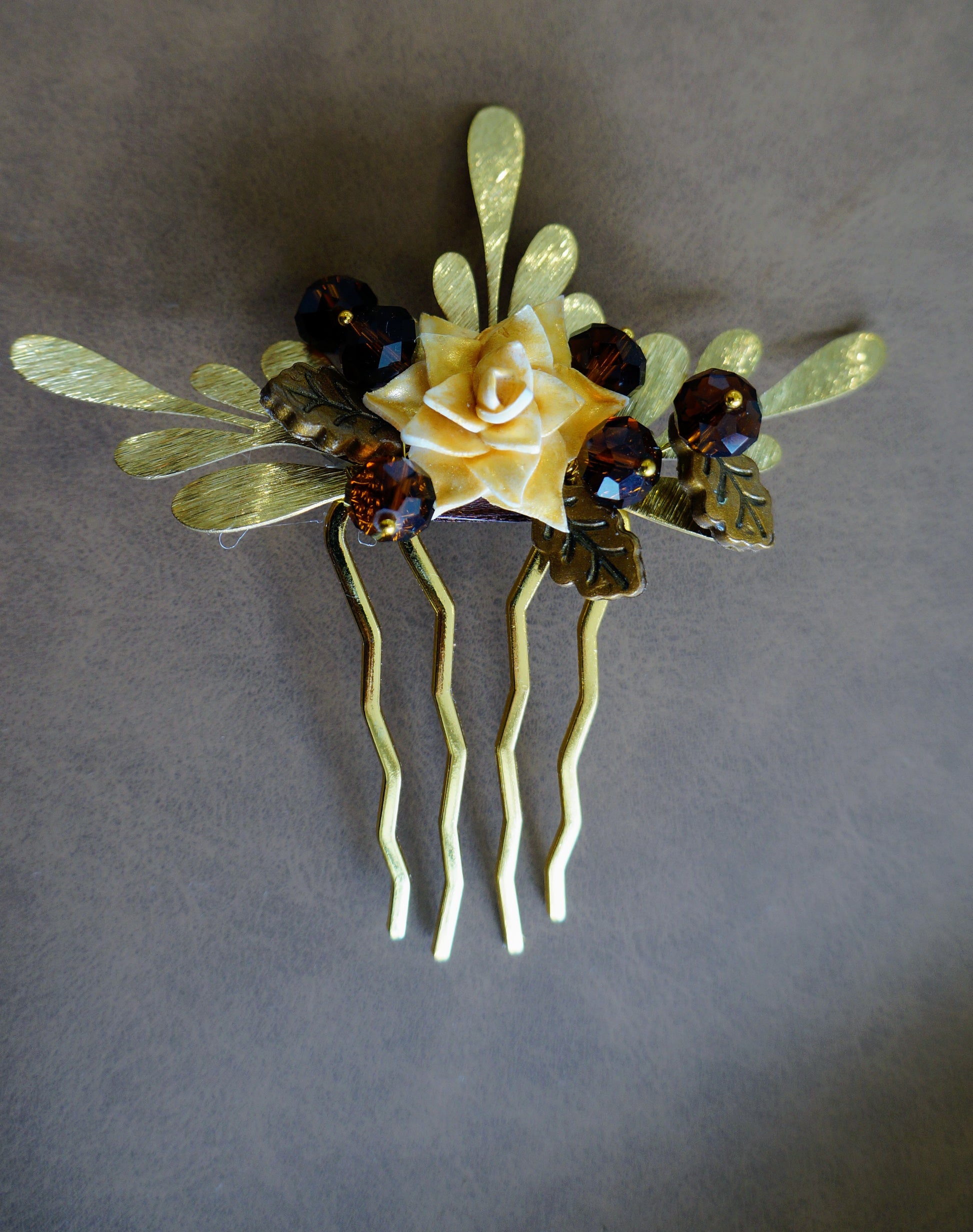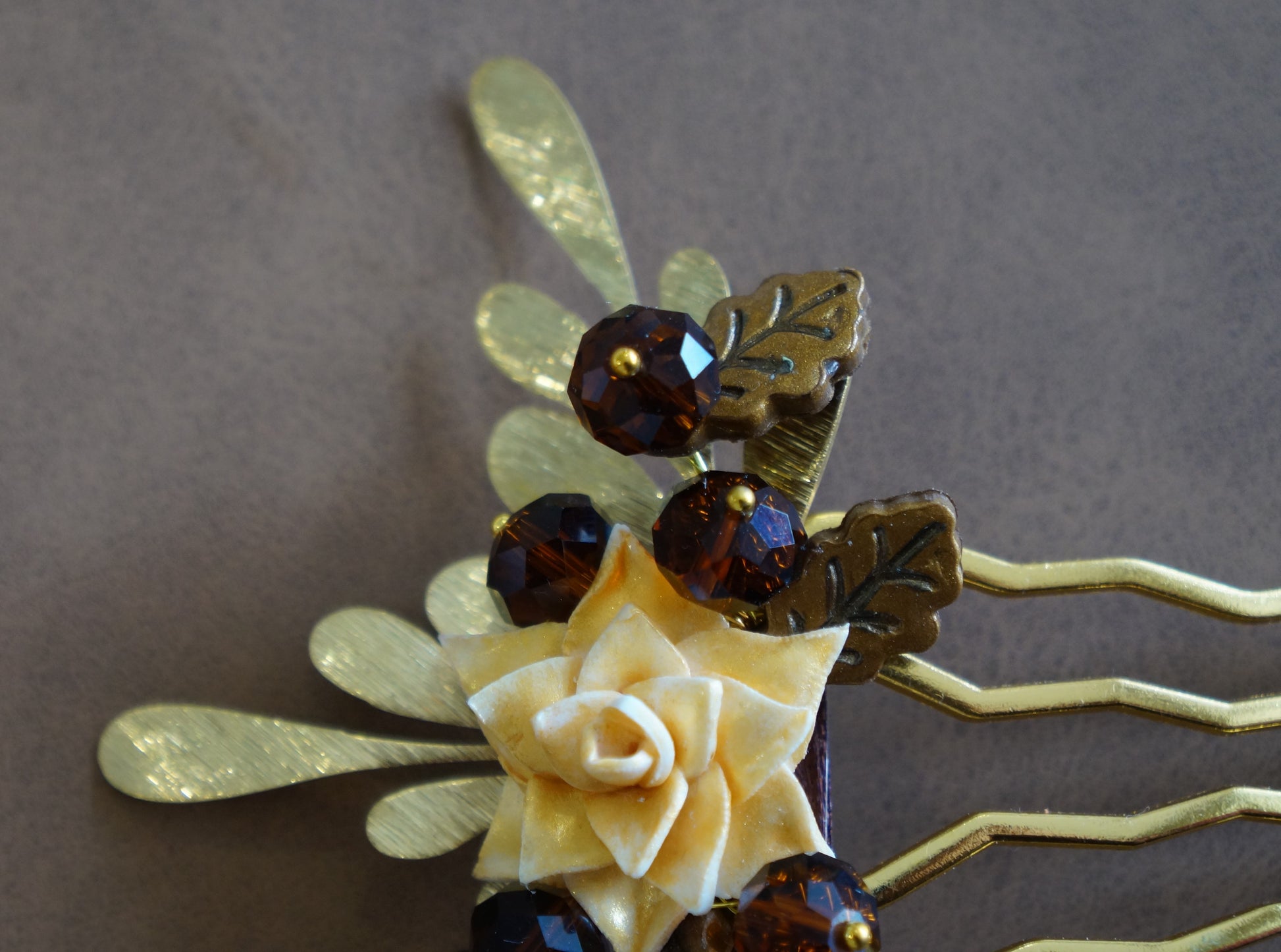 No centro, uma flor delicadamente moldada à mão em argila de polímero revela textura e profundidade, envolvida por folhas metálicas douradas que captam a luz com suavidade. Os cristais checos facetados em tom âmbar acrescentam pontos de brilho sofisticado, criando um equilíbrio harmonioso entre romantismo e modernidade.